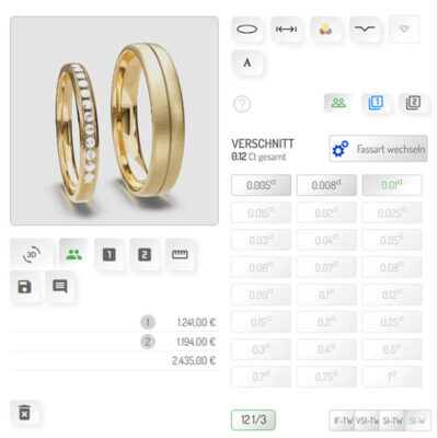 Gestalten Sie Ihre Trauringe bequem von zuhause aus nach Ihren Wünschen und Vorstellungen. Die Preise werden sofort angezeigt.