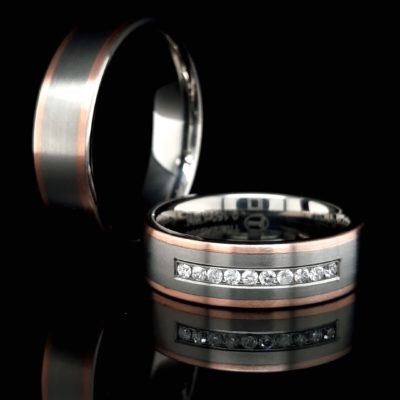 Ganz neu bei uns sind Trauringe mit Zirkonium, Titan, Einlagen in Farbgold und Diamanten.