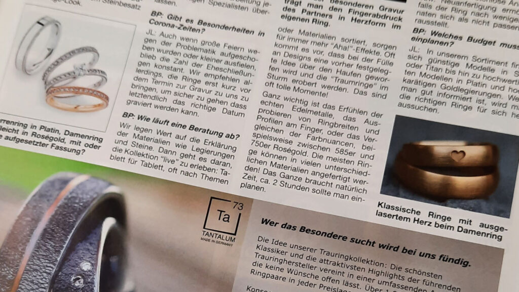 JL: In unserem Sortiment finden sich günstige Modelle in Stahl oder Titan bis hin zu hochwertigsten Modellen in Platin und hochkarätigen Goldlegierungen. Wenn man gut informiert ist, wird man die richtigen Ringe für sich heraussuchen.